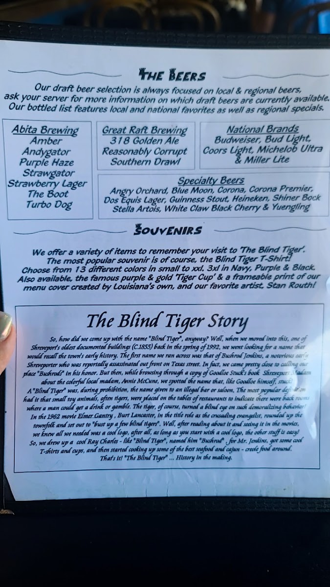 Welcome to The Blind Tiger, a delightful oasis of Cajun cuisine nestled in the heart of Shreveport, Louisiana. Located at 120 Texas St, this vibrant restaurant is quickly becoming a go-to spot for locals and visitors alike, drawing in crowds with its rich flavors and welcoming atmosphere. Whether you are craving authentic Cajun fare or simply want to experience a unique culinary journey, The Blind Tiger is poised to satisfy your appetite.